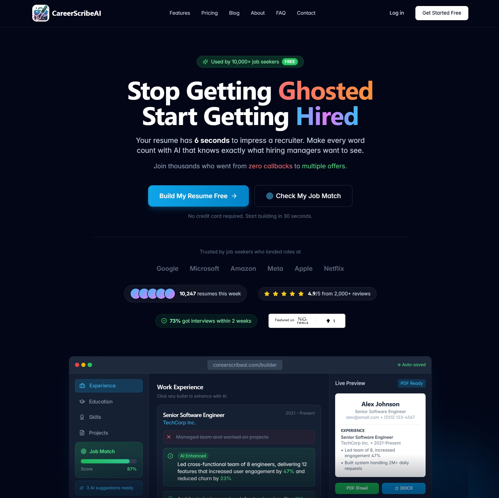CareerScribeAI is your AI career assistant. Build ATS-optimized resumes, generate tailored cover letters, prep for interviews, and optimize your LinkedIn - all powered by AI that understands what recruiters want.